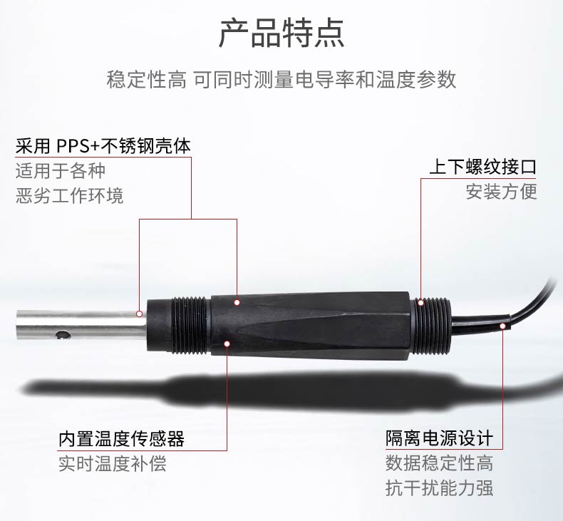 产品描述:电导率数字式电极采用 RS485 通讯接口和 Modbus RTU标准协议的数字式电导率传感器,可同时测量电导率和温度参数。本产品广泛应用于生活用水、生活污水、江河湖泊、自来水、市政污水、地表水、循环冷却水、软化水、二次供水、泳池等场合水质监测。