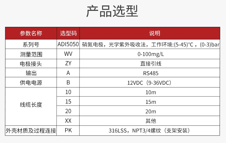 产品描述:ADI5050款硝氮电极是基于紫外光吸收法测量,一种利用紫外光谱分析技术,直接、快速、准确地测量水体中硝态氮,(NO3-N)浓度的先进在线监测设备。通过校正公式消除有机物干扰,最终根据朗伯-比尔定律将计算出的净吸光度值实时转换为硝酸盐氮(NO3-N)的浓度值,并通过数字信号输出。