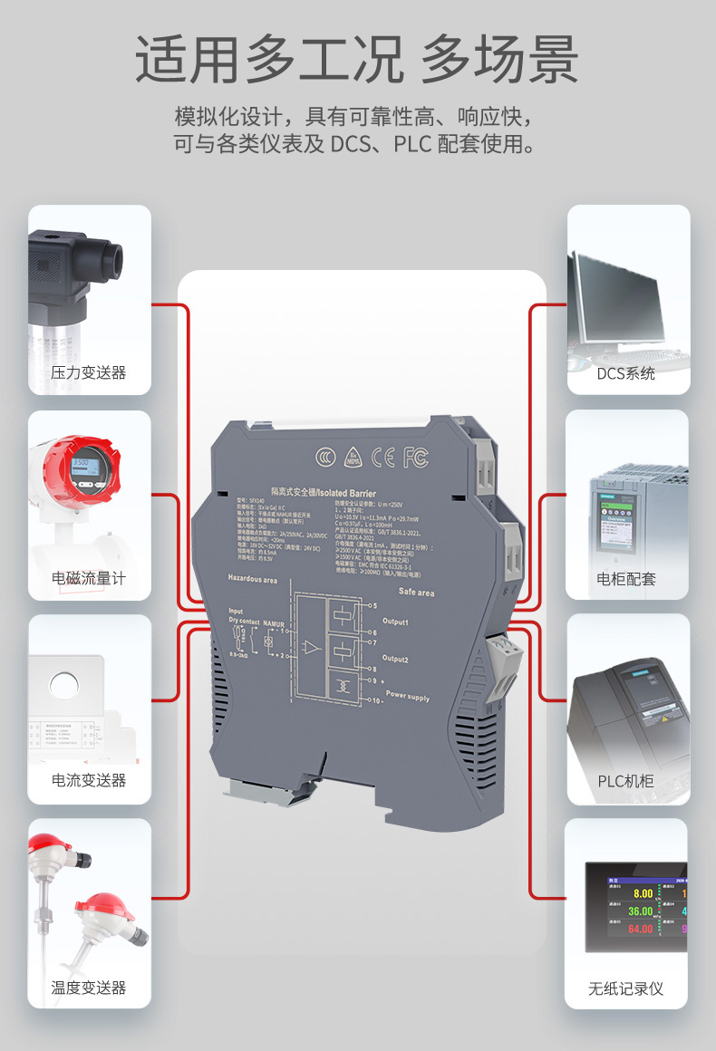 产品描述:隔离式安全栅向危险区的变送器提供隔离的工作电源,同时检测回路中的电流,经隔离变送输出电流或电压信号到安全区。