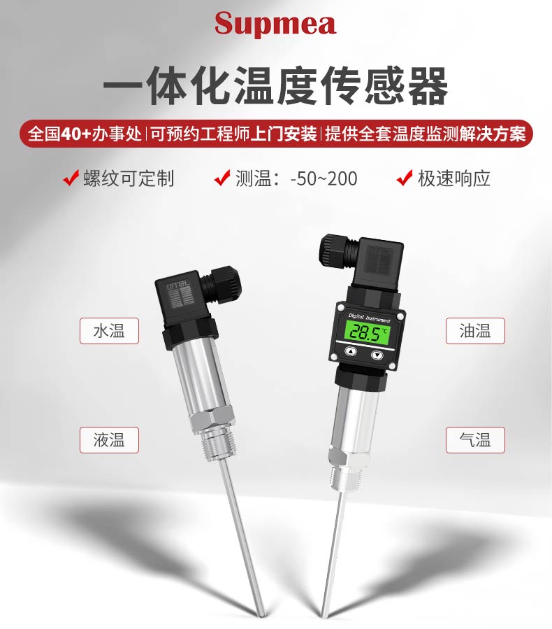 产品描述:本温度变送器采用 Pt100 温度传感器作为敏感元件,与信号转换放大单元结合为一体,用来测量各种工艺过程中液体的温度。本产品使用高稳定性的电路进行信号处理,实现温度连续测量和输出,采用高精度 24 位 ADC 转换为数字信号,同时可以实现显示、远传等功能。广泛应用于石油、化工、电力、轻纺、环保等领域中对水或油的温度测量。