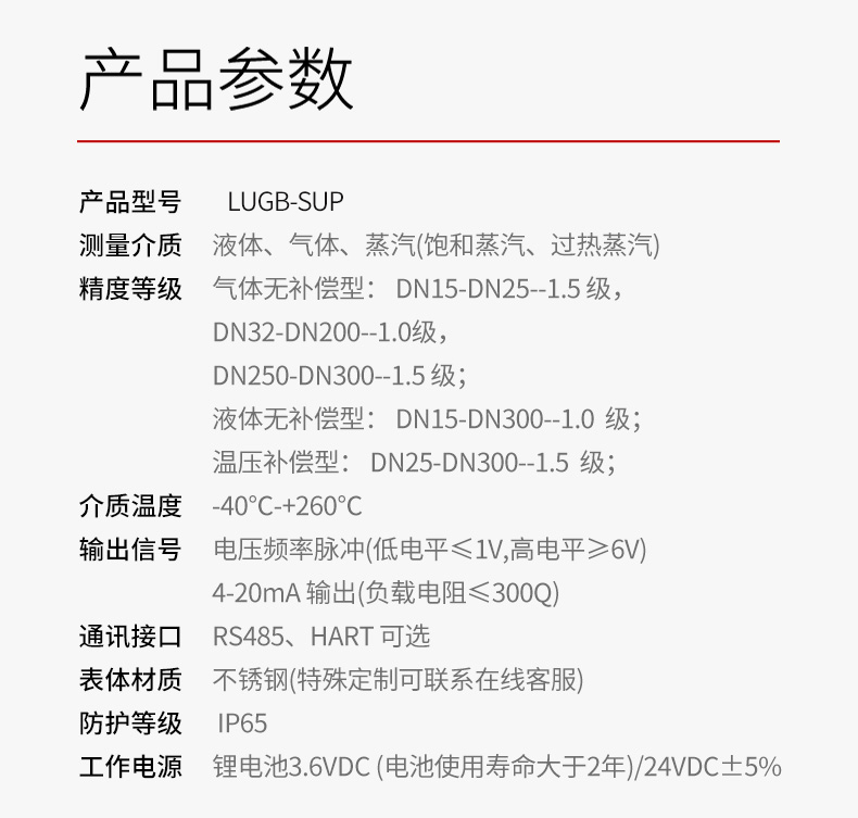 产品描述:LUGB-SUP-A涡街流量仪表广泛用于供热公司、热力公司、化工行业等行业,对过热蒸汽、饱和蒸汽、压缩空气和一般气体、水和液体的计量和控制。加厚本体,可有效避免现场管道振动带来的数据波动和误差。多用于高温场合,例如过热蒸汽等工况。