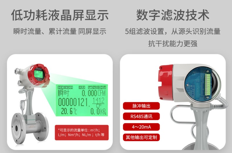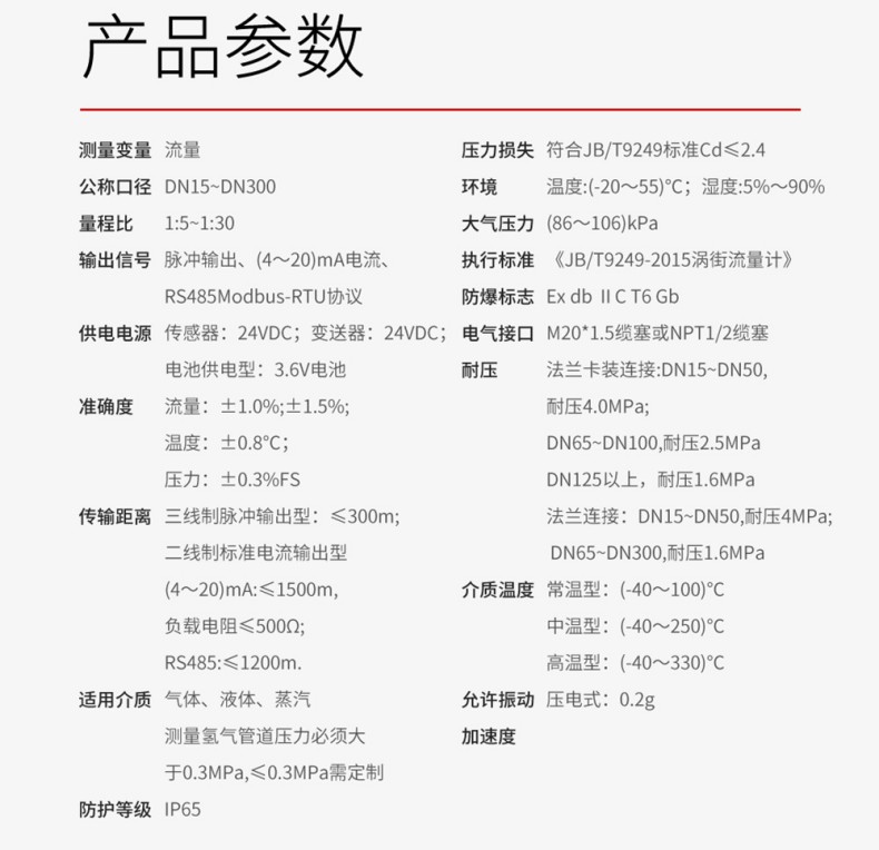 产品描述:LUGB 型涡街流量计根据选型不同可以实现以下功能:测量工业管道介质流体的温度、压力、瞬时流量和累计流量等参数,并具有脉冲输出、(4~20)mA 模拟信号出、RS485 通讯(Modbus RTU 协议)、物联网 GPRS 等功能。
