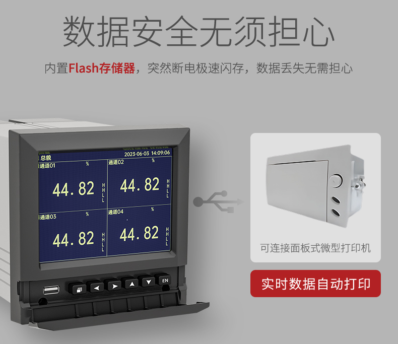 产品描述:SUP-R4000D系列无纸记录仪是一种高速高性能微处理器和5.6英寸彩色液晶显示屏,对现场各种温度、压力、流量、电量等信号实现监测、控制和记录功能。 SIN-R4000D系列无纸记录仪可自由组态输入标准电流、标准电压、热电偶、热电阻、频率等信号,可实现为传感器配电和继电器报警输出,并且可通过U盘或通讯方式与上位机进行数据交换。