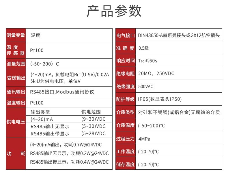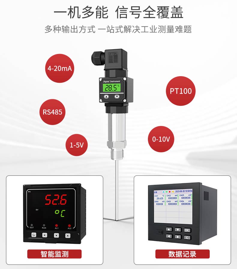 产品描述:本温度变送器采用 Pt100 温度传感器作为敏感元件,与信号转换放大单元结合为一体,用来测量各种工艺过程中液体的温度。本产品使用高稳定性的电路进行信号处理,实现温度连续测量和输出,采用高精度 24 位 ADC 转换为数字信号,同时可以实现显示、远传等功能。广泛应用于石油、化工、电力、轻纺、环保等领域中对水或油的温度测量。