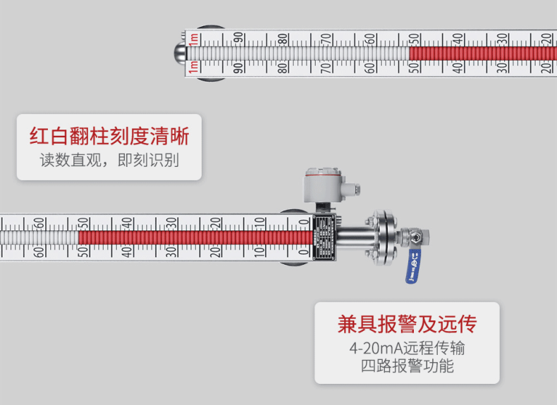 产品描述:磁翻板液位计根据浮力原理,实现液位的指示,并且在液位计的主体上安装变送器,可以实现远传显示。适用于低温到高温、真空到高压等各种环境,是石油化工等行业理想的液位测量产品。